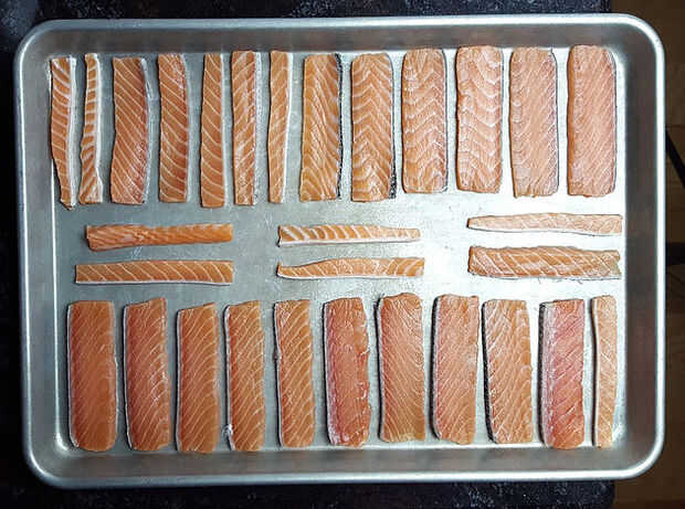 Extiende las rebanadas de salmón en una placa para horno rociada con spray de cocina y hornear en horno precalentado a 200° F durante 6-8 horas, los bancos la mitad.