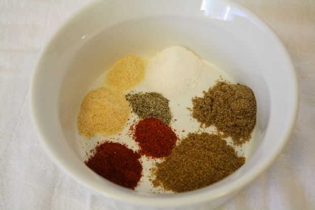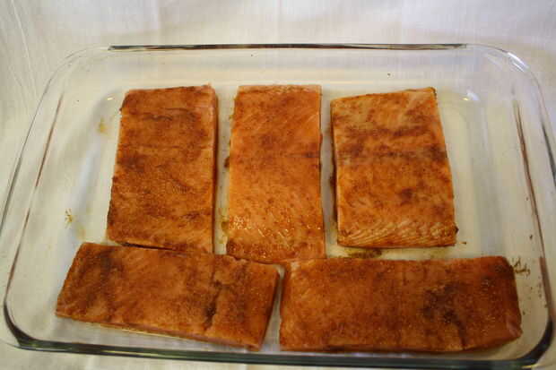 Mezcle sal, pimienta, ajo en polvo, cilantro, comino, pimentón, pimienta de cayena y cebolla en polvo. Agregar aceite de oliva y revolver en una pasta. Frote pegue en salmón y salmón de refrigerar por una hora.