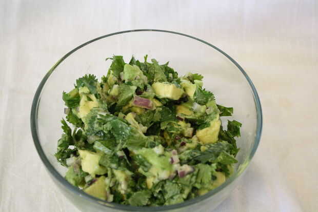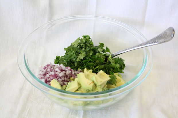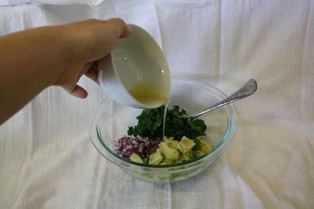 Dados de aguacate, cebolla morada y cilantro. En un tazón pequeño, mezcle el aceite de oliva, jugo de limón, sal, pimienta y comino. Verter sobre el aguacate/cilantro y revuelve. Refrigere hasta que esté listo para servir.