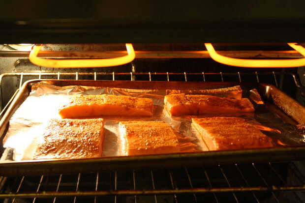 Precaliente la parrilla. Cubrir una bandeja de galletas o asadera con papel de aluminio y rociado con spray antiadherente. Poner el salmón en galletas y coloque aproximadamente 6 pulgadas debajo de la parrilla. Cocer durante 4-5 minutos por cada lado, vigilando de cerca. Salmón se debe cocinar a 145 grados.