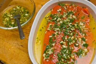 Primera foto muestra el adobo preparado en un tazón; segunda foto después de los peces de la capa.