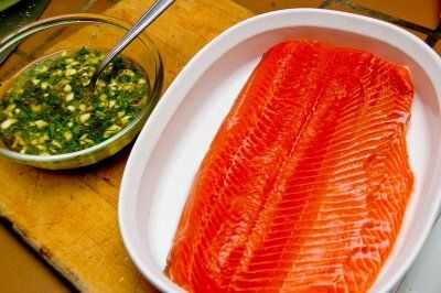 (Nota: estas fotos fueron agregadas después de la publicación inicial, según lo sugerido por otros, para ilustrar los pasos en el proceso de marinado. Sin embargo, las fotos son de otro período de sesiones, para cocinar con otro buen pedazo de Alaska temporada fresco salmón rojo.)