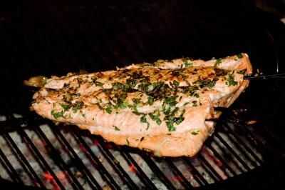 Salmón en 3 o 4 pinchos largos del hilo de rosca (si es madera, remojo en agua durante al menos 30 minutos). Usando más de dos pinchos mantiene intacta el salmón y hace más fácil dar la vuelta a la parrilla. Además, prefiero dejar la piel en los peces, como este ayuda a mantener juntos (puede ser quitado después de asar a la parrilla).