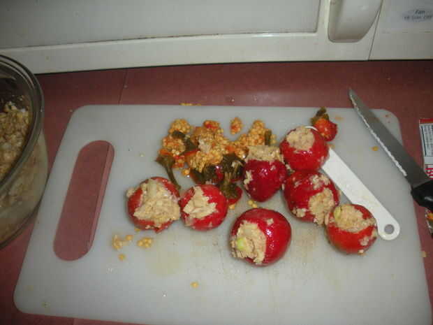 Tomates rellenos y pimientos, son saludables, puede ser comido caliente o frío y son una maravilla para un almuerzo de oficina. Son más sabrosas el día después de que se han hecho y puede ser acompañado con una cucharada de yogur griego .Paso 1: ingr