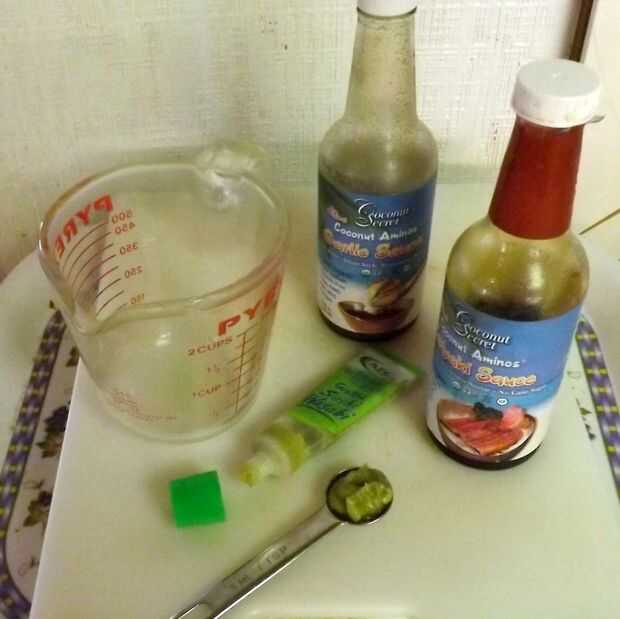 2. Añadir aproximadamente 1 cucharadas de la salsa Teriyaki a la taza y revuelva para mezclar la pasta de wasabi (disolver).