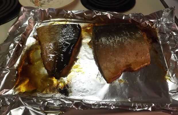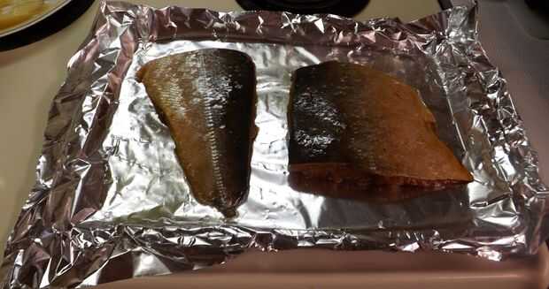 - * Nota: como se puede ver, probablemente trató de quitar la piel de los filetes de salmón un poco demasiado pronto y romper una pequeña sección del filete más grande (aunque decepcionante, sabía muy bien)!