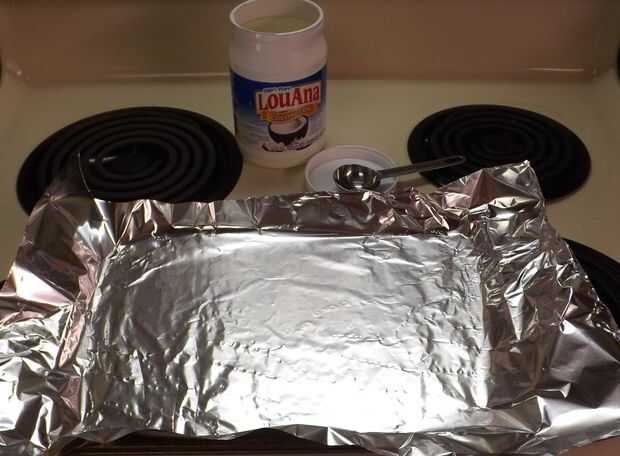 - Cuando el horno ha terminado el precalentamiento, coloque las 3 cucharadas de aceite de coco en una sartén de hierro fundido pesado o sobre una bandeja para hornear con borde de acero de carbón cubierto con papel de aluminio de servicio pesado (si usas una placa para horno, asegúrate de que está preparada para soportar por lo menos 450-500 grados de calor. Hubiera preferido usar una sartén de hierro fundido pero mía no era lo suficientemente grande para aceptar las dos porciones de salmón, usé un recipiente de acero al carbono de Wilton).
