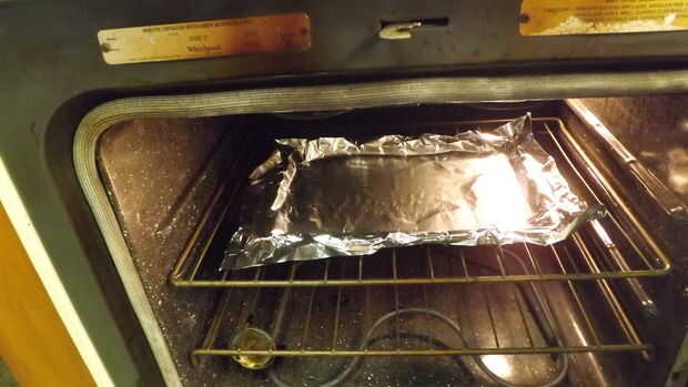 - Cuidadosamente Introduzca el pan cubierto de aceite en el horno caliente y calentar hasta que el aceite es chisporrotear caliente y fumar (unos 4 o 5 minutos). (El detector de humo de cocina puede ir Tuve que quitar minas temporalmente y encender el extractor de la cocina)!