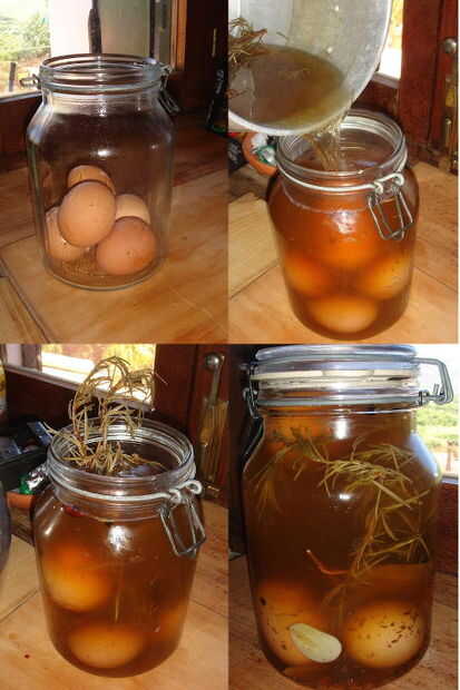 Ahora, vierta la salmuera todavía caliente sobre los huevos.