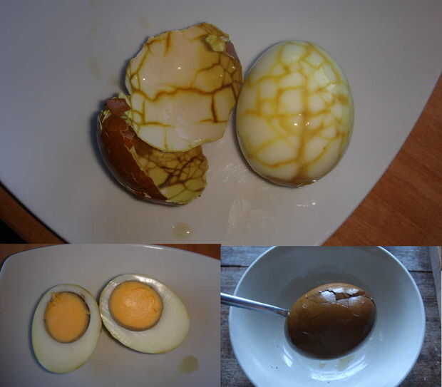 Para comer solo tome ellos fuera de la salmuera, pelarlas (verá un color más oscuro donde se agrietó la cáscara de huevo, la mirada bastante funky los huevos! Como dije al principio que usted puede Agregar jugo de remolacha, por ejemplo, los huevos tendrán una coloración violeta y pueden utilizarse muy bien para Halloween...