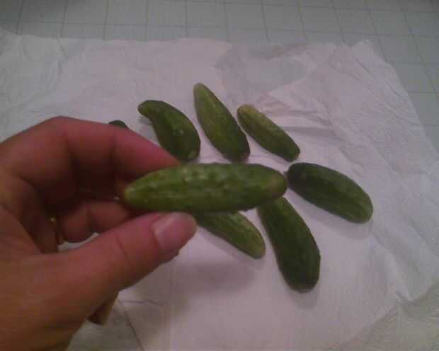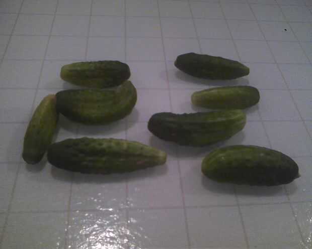 La piel de sus dientes de ajo. Coloque 3 cabezas del eneldo en el fondo de tarros (corté el eneldo por lo que hay cerca de 5 pulgadas del tallo a la cabeza de eneldo). Luego coloque un clavo grande o 2 pequeñas y medianas dientes de ajo en el fondo del tarro. A continuación, llenar tus tarros con sus pepinos. Yo uso pepinos de conserva en vinagre dulce de mi jardín. (En mi opinión: si hacer encurtidos todo, el mejor tamaño para el gusto y textura crujiente es 3 a 4 pulgadas. Si alancear sus encurtidos, entonces yo usaría unos 4 a 5 pulgadas de largo y les cuarto.) Asegúrese de embalar sus tarros firmemente con tus pepinos. Añadir medio diente de ajo en la parte superior de los pepinos. Entonces puso dos cabezas más de eneldo fresco en la parte superior.