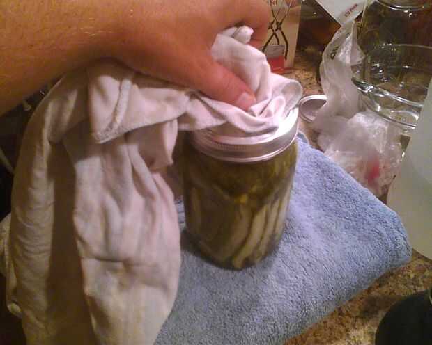 Tomar una toalla limpia y seca y limpie los bordes de los tarros.  Asegúrese de que ellos se limpian limpio y seco.  Luego tomar los párpados que han estado hirviendo suavemente y con cuidado en frascos y tornillo en anillos como apretado como usted puede hacer.  Colocar frascos en agua hirviendo conservas pote y ponga la tapa en la olla.  Proceso de salmueras durante 10 minutos (hacer que el agua está hirviendo para todo 10 minutos y agua cubre frascos por 1 a 2 pulgadas sobre las tapas).  Cuidadosamente retire los frascos y poner sobre una toalla limpia y seca. Limpie las tapas de frascos con otra toalla limpia y seca y deje sentarse en mostrador durante 24 horas.  Esto proporciona tiempo para sellar y enfriar.