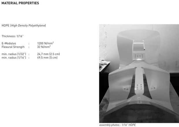 El material del sistema elegido en este proyecto es de láminas de polietileno (HDPE) de alta densidad de 4 pies x 8 pies de 1/16 '' de espesor. El proceso que hemos seguido implica investigación de propiedades de los materiales (radios mínimos de flexión, módulo de Young etc.) y simulación en el software FEA Sofistik, a fin de explorar y concretar la forma doblada. El método de fabricación que es el más adecuado para este material en términos de velocidad y precisión, se corte en el cortador de la lámina de Zund.