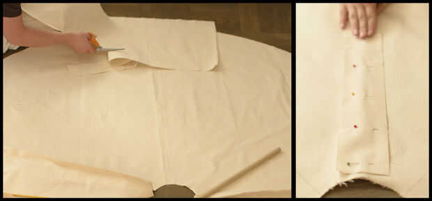 Cortar cada tira de 3 pulgadas de ancho (o más si tiene tacos más grandes) y pin para que quede centrado a lo largo de las líneas marcadas en el paso anterior.