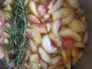 Cortar los melocotones en pulgadas de 1/2 rodajas. Coloque los melocotones en un recipiente grande, agregue pimienta, azúcar, Romero y zumo de limón. Cubra y deje reposar por 4 horas. Revuelva cada hora para incorporar el azúcar.