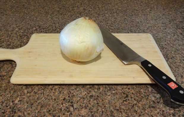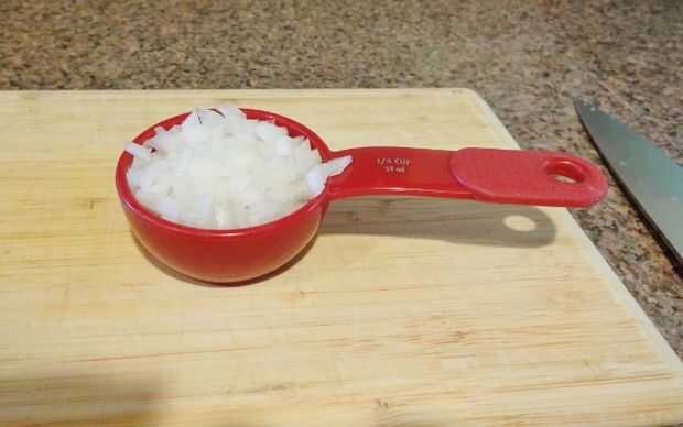 Agarra tu cuchillo y tabla para cortar y picar una parte de la cebolla amarilla. Sólo 1/4 taza necesitada. También picar el ajo si usted no compra cualquier ajo previamente picado. Sólo 2 cucharadas necesitadas.
