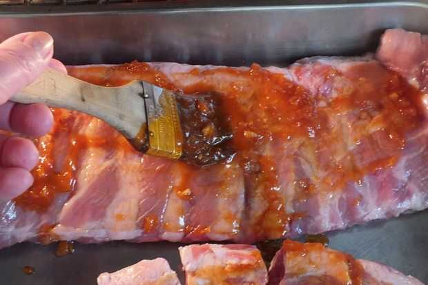 Propagación salsa sobre las costillas de cerdo trasera que han tenido su fina membrana quitado, enjuagarse y secarse.