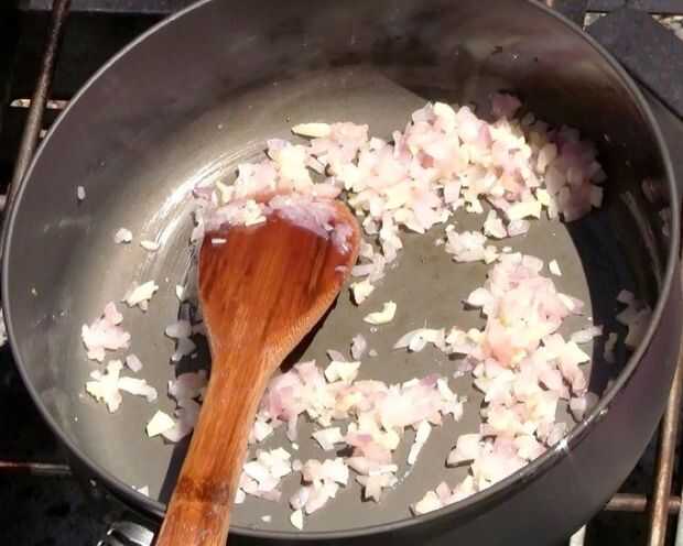 Utilizando un baja med precalentado mi pan solo para un par de minutos, agregar aceite de oliva y salteado mi cebolla hasta transparente, añade entonces mi ajo.