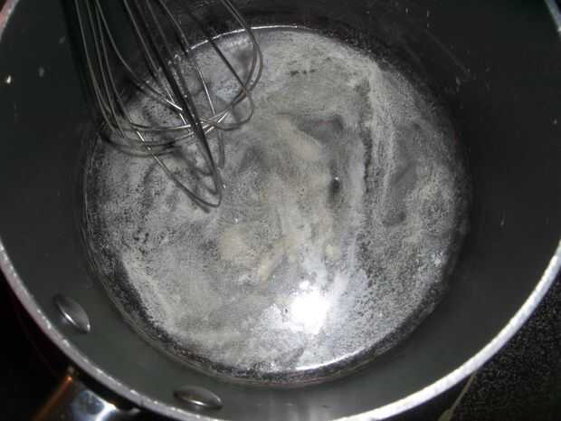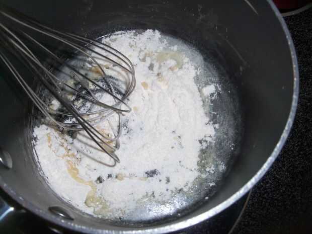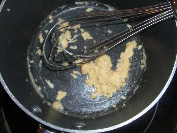 derretir 2.) la mantequilla en una salsa medio pan luego batir en la harina hasta que se forme un roux. Entonces el cocinero dijo roux durante aprox. 5 minutos.