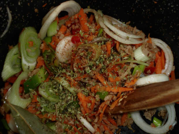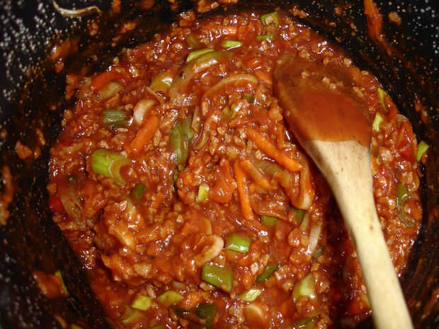 Freír (fuego lento) la TVP con las verduras, orégano y laurel. Tenga cuidado de no quemarla; Añadir salsa de soja para mantener la mezcla hidratada y seguir removiendo. Después de un par de minutos agregar el puré de tomate. Luego esperar otros cinco minutos, revolviendo ahora y después.