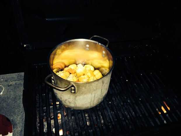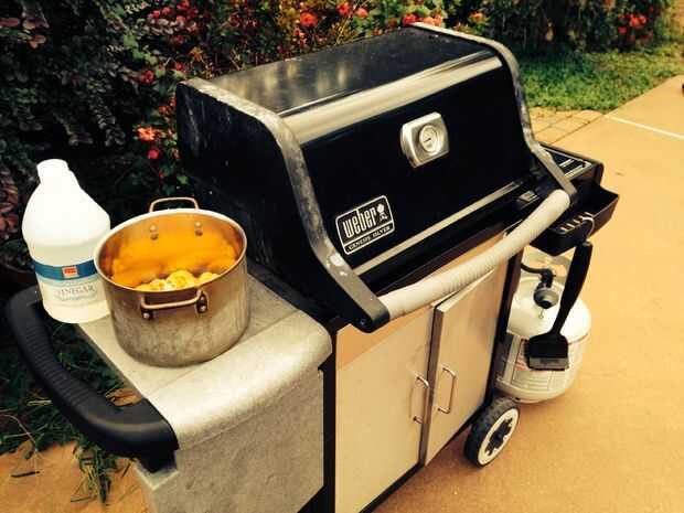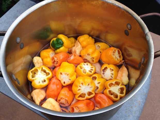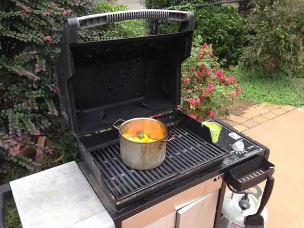 - Poner el bote de pimientos a la parrilla, cierre la tapa y cocine a fuego alto durante unos 25 minutos. Los pimientos deben estar en el vinagre hirviendo durante unos 15 minutos.