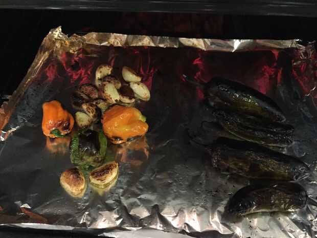 Una vez terminando los Jalapeños, asado y oscuro por todos lados (rotaciones de 4-5) a continuación, agregue el ajo y los Habaneros. Se cocinan muy rápidamente y puede quemar fácilmente si no. Así mismo proceso que los Jalapeños, sorteo los Habaneros y los ajos en la izquierda por el petróleo y transferencia a la misma como utilizado y asan. Compruebe y voltear cada minuto (cerca de 5 en total)