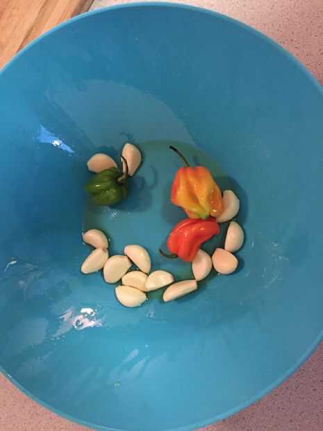 Mismo cuenco mezcle el Chile Habanero y ajo y asado. (Yo asado después de jalapeño, pan mismo)