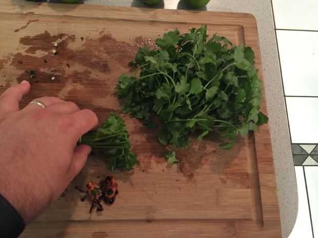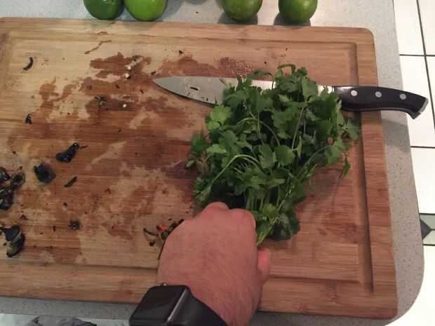 Cortar la medida del cilantro. Generalmente corté justo por debajo de las hojas más bajas en el paquete. Enjuague / Lave y escurra el agua adicional.