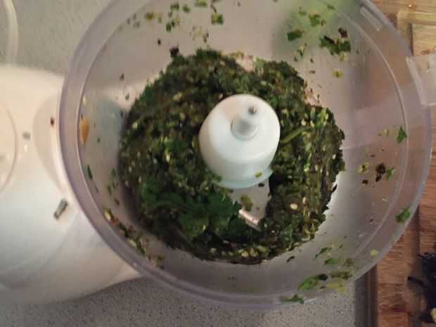 Dar el procesador de alimentos una ráfaga 5 segundo, raspar hacia abajo los lados y luego un adicional 3 seg. Más o menos dependiendo de cómo te guste.