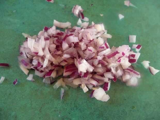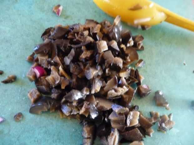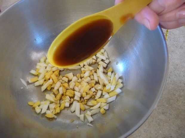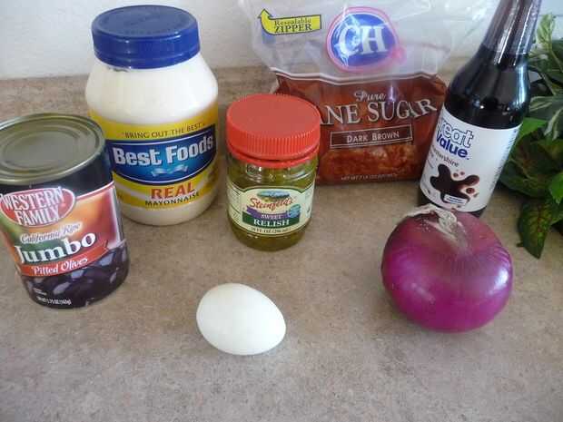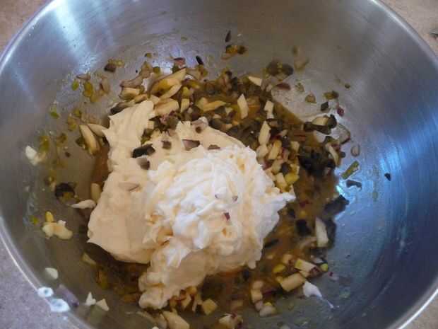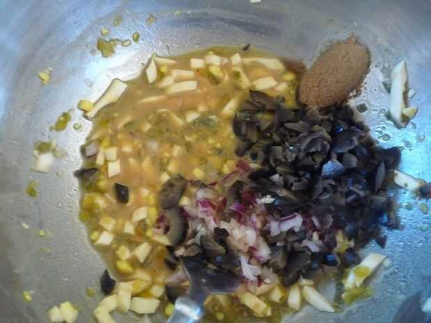 Picar el huevo y colocar en un bol. Añadir el vinagre de vino tinto y Worchestershire, revuelva. Añadir la cebolla picada, aceitunas negras, salsa de pepinillo dulce y azúcar morena. Revolver. Agregar el semiescabechadas y revolver hasta que esté cremosa.