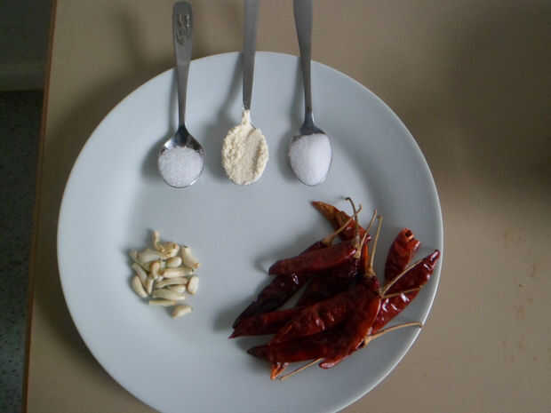 1 Lave chill y el ajo a que se seque. Lo mismo ocurre con el cuchillo de cocina y el bloque.2 cualquier proporción es buena. Corte frío y ajo por separado.3 romperles.4 la picada Mix chilly y ajo, luego agregar sal.5 añadir un poco de licor o espírit