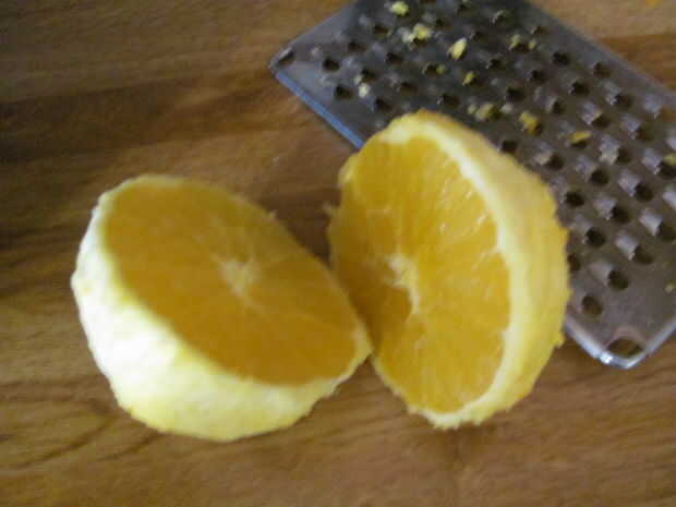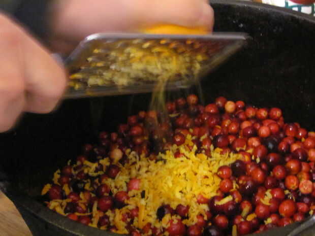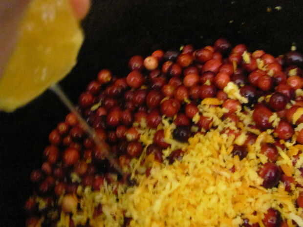 Tomar una naranja y peladura de la piel toda en la olla. Cortar dos naranjas por la mitad y exprimir tanto jugo en la olla como sea posible. Si tienes un exprimidor de naranja, utilizarlo. No tengo uno, así que tuve que apretarlas duro.