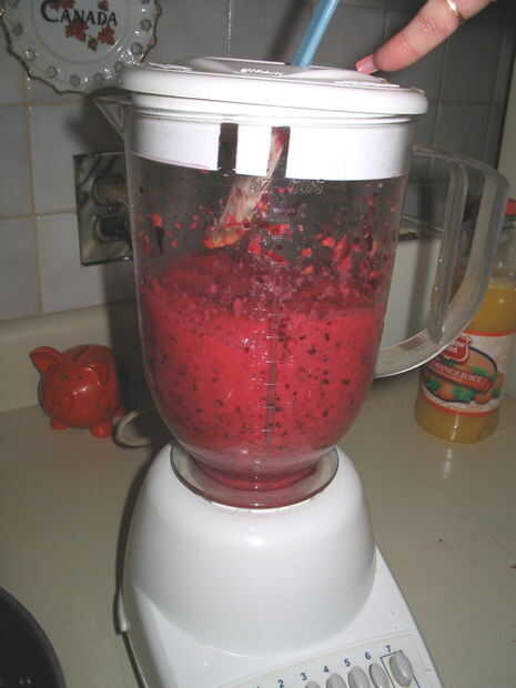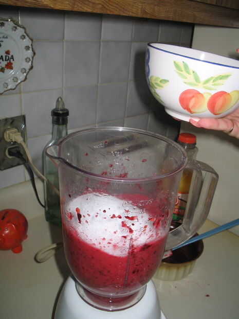 Como moliendas, seguir añadiendo arándanos, secciones de naranja y jugo (si es necesario) hasta que esté todo terreno y sobre la consistencia de un batido espeso. Mientras se sigue mezclando, poco a poco añadir el azúcar (edulcorante) en la mezcla.