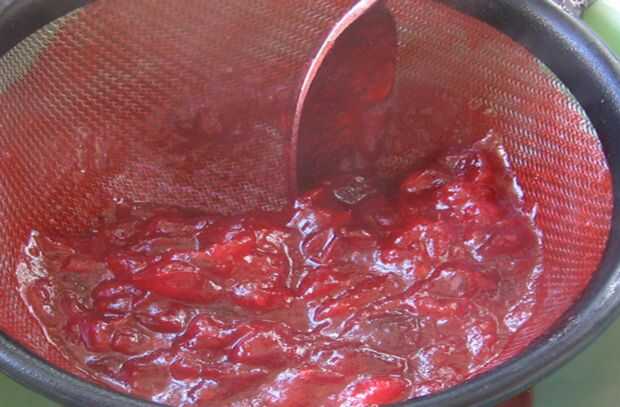 3. retirar del fuego. Cuando se acaban los arándanos cocina, vierta en el recipiente de la fábrica de alimentos, tamiz/tamiz de malla y utilice una espátula de goma para trabajar a través, hasta que todo lo que queda en el recipiente de la comida molino/filtro es semillas y pieles.