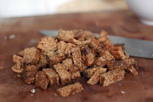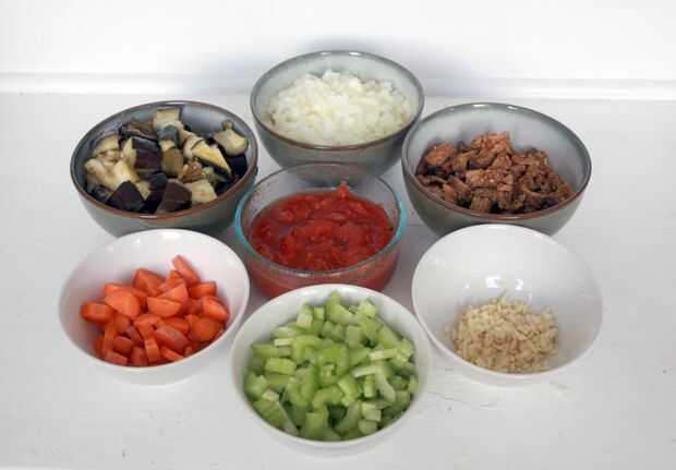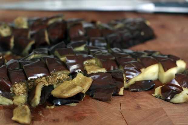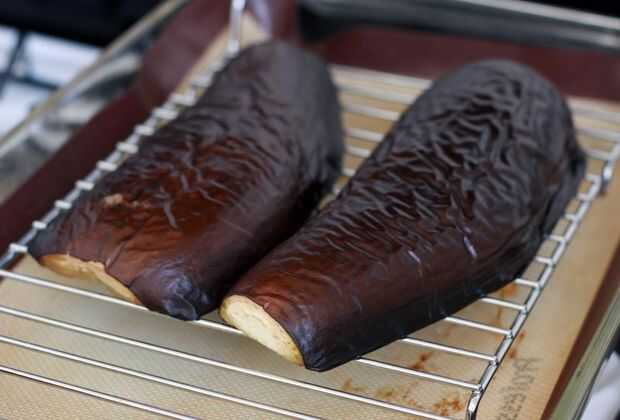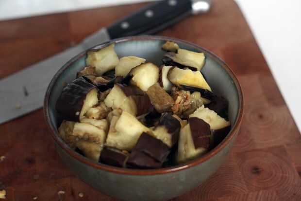 Plan de una hora para preparar la berenjena, si es asado o no. Prefiero el sabor rico, humeante de berenjenas asadas. Para lograr esto, partí la berenjena por la mitad, anotó a la mitad de la carne en cada mitad y asado en una bandeja para hornear engrasada, la carne hacia abajo, durante 20 minutos a 400F (200C).
