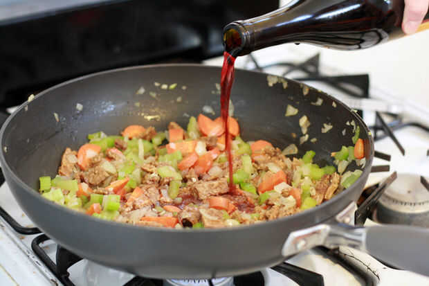 Agregue el vino y deje hervir a fuego lento hasta que se evapore el líquido.