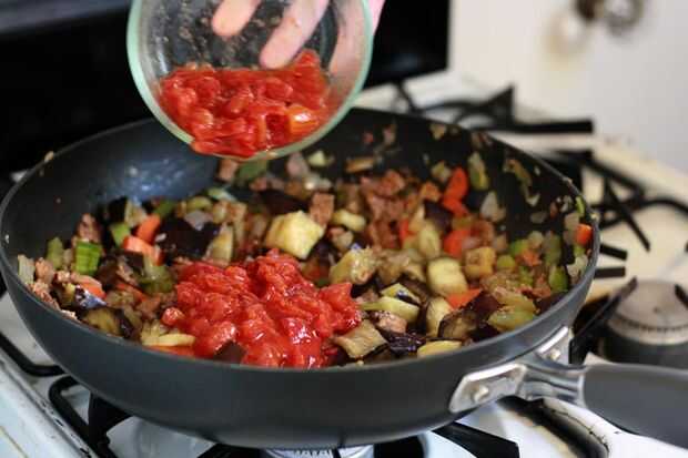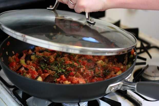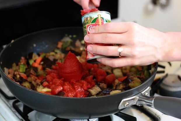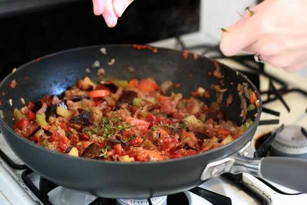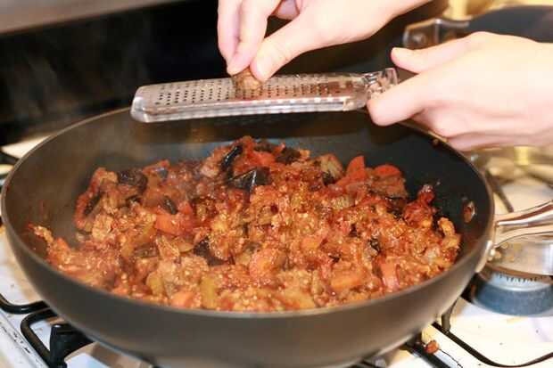 Stir en berenjena (si no lo has hecho todavía), tomates, pasta de tomate, agua, tomillo fresco y un afeitado de nuez moscada y suavemente a fuego lento, cubierto, hasta que la salsa se espesa, 1 a 1 1/2 horas.