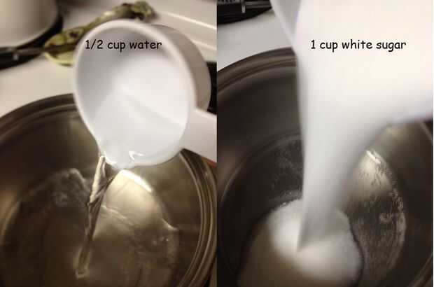 Para lo que necesitamos para empezar, es 1/2 taza de agua y vierta en una salsa de gran pan. Es importante utilizar una cacerola grande. Vamos a explicar más adelante sobre por qué. Poner la olla sobre fuego medio y llenar una taza con 1/2 taza de agua y vierta en la cacerola. El pan debe ser algo caliente en el momento que Vierta el agua en la cacerola. Luego agregar 1 taza de azúcar blanco y revuelva con un batidor hasta que el azúcar se disuelva.