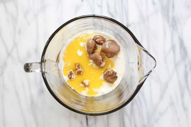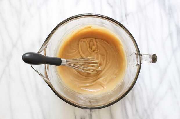 En el vaso de medida grande, combine el azúcar, la mantequilla derretida y la crema. Batir esta mezcla bien hasta que es agradable y suave.