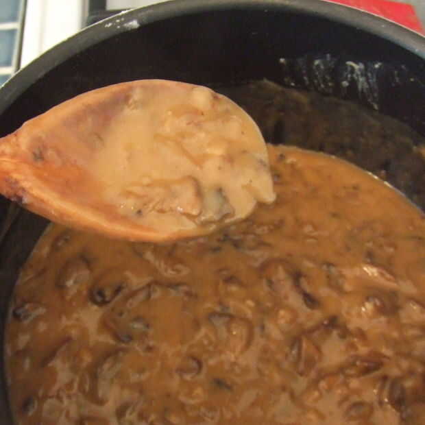 Vierta los trozos de setas en el roux. Remover mucho. A espuma, pero sólo seguir removiendo y verter. La salsa debe ser espesa y brillante. Probablemente va a ser demasiado gruesa. Esto es cuando se agrega el caldo de verduras o agua para diluir. Si es muy grueso, no sólo tiene que añadir caldo de verduras--es demasiado salado. Agregar el agua también. Si eres frugal como mi abuela levantó de depresión, a añadir el agua de la patata de su puré de papas. Teóricamente tiene un montón de vitaminas y ya está caliente.