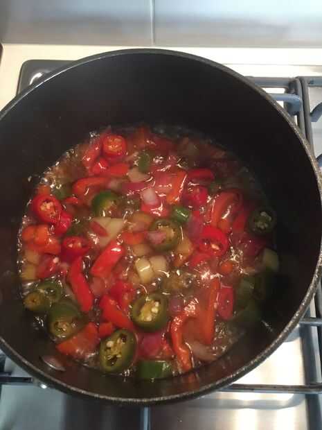 tiempo: 3 horasMarcas: 6-8 (recipientes de 32 oz)Ingredientes5 libras de tomates10-20 guindillas (tantas como quieras... Me gusta mina caliente)6 pimientos verdes2 cebollas grandes2 cucharaditas de mostaza seca1 cucharadita sazonador de chili1 taza d