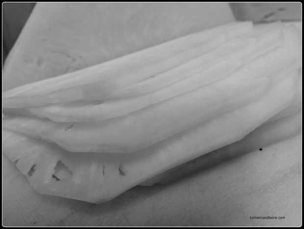 Pelar toda la piel de los colinabos, incluyendo la capa interna fibrosa, hasta solamente el blanco interior de restos. Rebanada en finas, 5 rodajas de milímetro. Cortar las rebanadas en tiras delgadas y luego cortar en trozos pequeños.