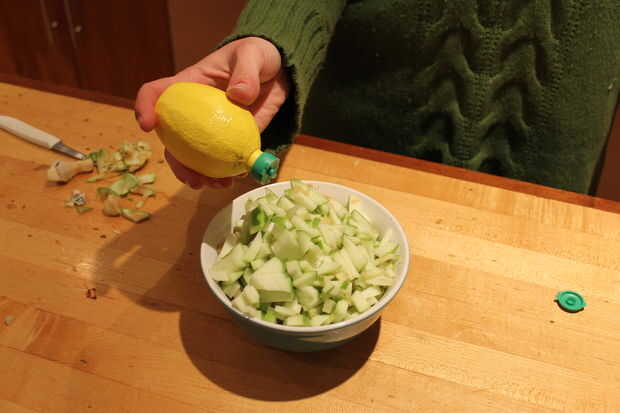 Agrego unos arroja a chorros de jugo de limón a la mezcla de manzana y pera para mantenerlos de dorado y de sabor.