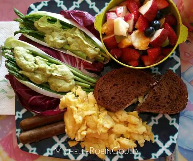 Servir salsa frío más frío espárragos al vapor, en barcos de escarola. El perfecto acento picante de huevos revueltos, veggie salchicha enlaces, un sándwich de té de queso crema de pepino en pumpernickel y fruta fresca.