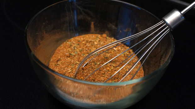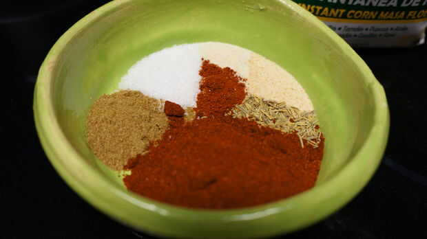 Combine el Chile en polvo, Sal Kosher, Romero, pimentón, cebolla en polvo, comino y el ajo en polvo en un tazón pequeño y bata bien. Si no vas a usar fresco chiles serranos agregar 1/2 cucharadita de pimienta de cayena y apartar.