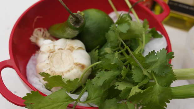 Lavar el limón, cilantro, cebolla verde y pimientos