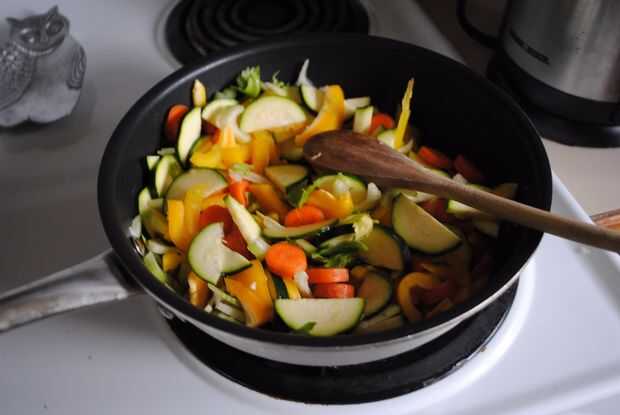 Añadir 1-2 cucharadas de aceite a una sartén o wok y revuelva freír las verduras en medio de 10-15 minutos, hasta que estén tiernos. Usted podría omitir este paso si desea dejar la olla en todo el día, pero tenía hambre así que utilizó esto para acelerar el proceso.