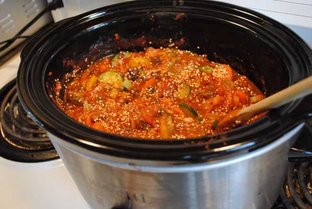 Añadir 1/2 taza de quinua secada a la olla unos 30 minutos antes de sacar de la olla. La quinua se ampliar en el líquido de la salsa, pero no sobre cocinar y mantener su textura. Mezcle bien. Alternativamente, podría cocinar la quinoa por separado y añadir al final.