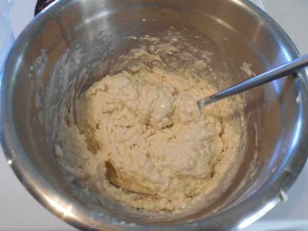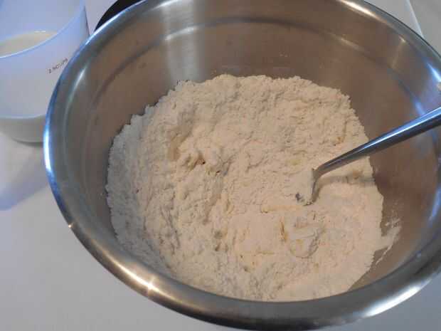 Colocar harina, azúcar y sal en recipiente con mantequilla. Romper con un tenedor hasta que desmenuzable y agregar polvo de hornear y la grasa de tocino. Revuelva un poco.