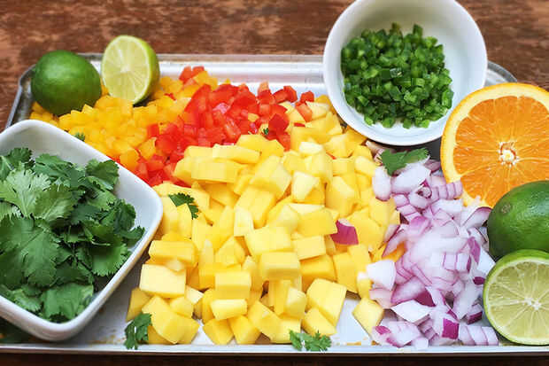 me encanta esta ensalada. He disfrutado de salsa de mango con pescado y pollo, pitas y tortilla chips, maridaje con cuscús israelí (perla) para una ensalada solo hace un maravilloso plato, una comida de almuerzo o una satisfacción de bocado, mañana o